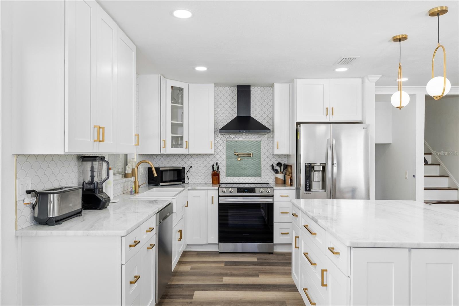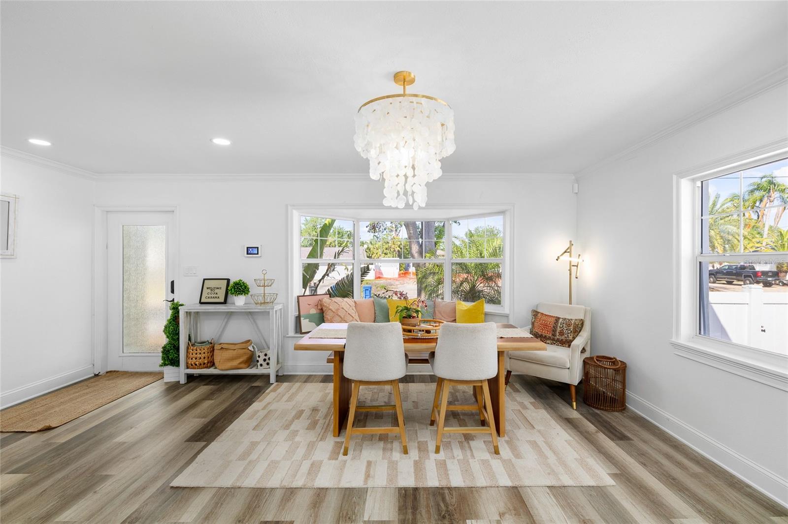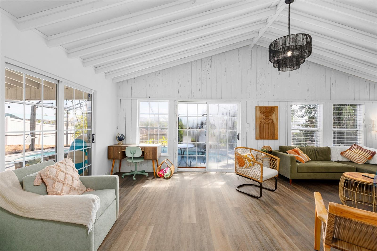 Step inside this turnkey oasis, where modern comfort meets effortless style. This stunning home boasts high end contemporary fixtures and trendy designer finishes, offering a perfect balance of modern sophistication and warm, inviting charm. The gourmet kitchen boasts top-of-the-line appliances, chic brass hardware, pot filler, large island and marble countertops. The expansive windows and French doors open seamlessly to the poolside retreat, bringing in natural light and enhancing the home's airy feel, ideal for both entertaining and everyday relaxation. In the living area, soaring cathedral ceilings and wall-to-wall windows provide a stunning backdrop, complemented by a cozy wood-burning fireplace. Sliding glass doors lead outside, ensuring a smooth transition between indoor and outdoor spaces. This floor also features an additional seating area, bedroom and a stunning full bathroom designed to impress. Ascend to the third floor, where you’ll find two beautifully appointed guest bedrooms and a stylish guest bathroom, along with the serene master suite. Indulge in a spa-like experience in the luxurious en-suite bath, featuring dual sinks, a sleek walk-in shower, and designer finishes. Outside your private oasis awaits! Screened in lanai with an outdoor wet bar and plenty of seating room for outdoor entertainment. Soak in the canal view with direct access to the bay. Whether you're searching for your dream home, a luxurious vacation retreat, or a savvy investment opportunity, this stunning property offers it all! With short-term rentals allowed, you can maximize its potential as a lucrative rental or enjoy it as your own private getaway. Don’t miss the chance to own a piece of paradise!